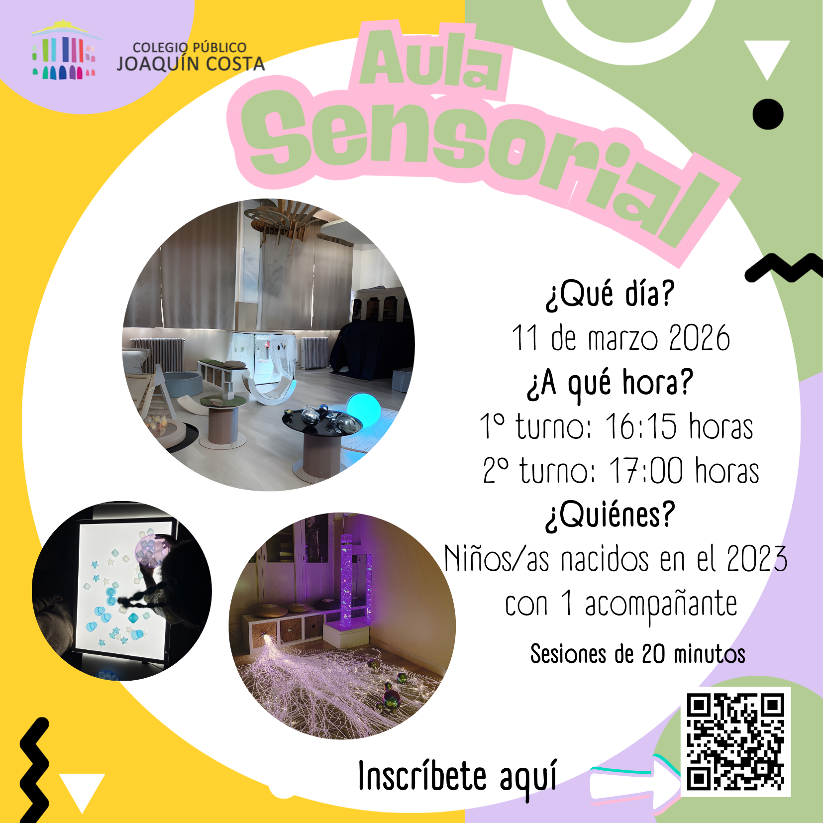 BIENVENIDOS A NUESTRA AULA SENSORIALEstamos deseando que vengáis con vuestros peques a conocer un aula muy especial en nuestro centro.Para ello podéis apuntaros rellenando el formulario (desde el enlace o el QR de la imagen) |