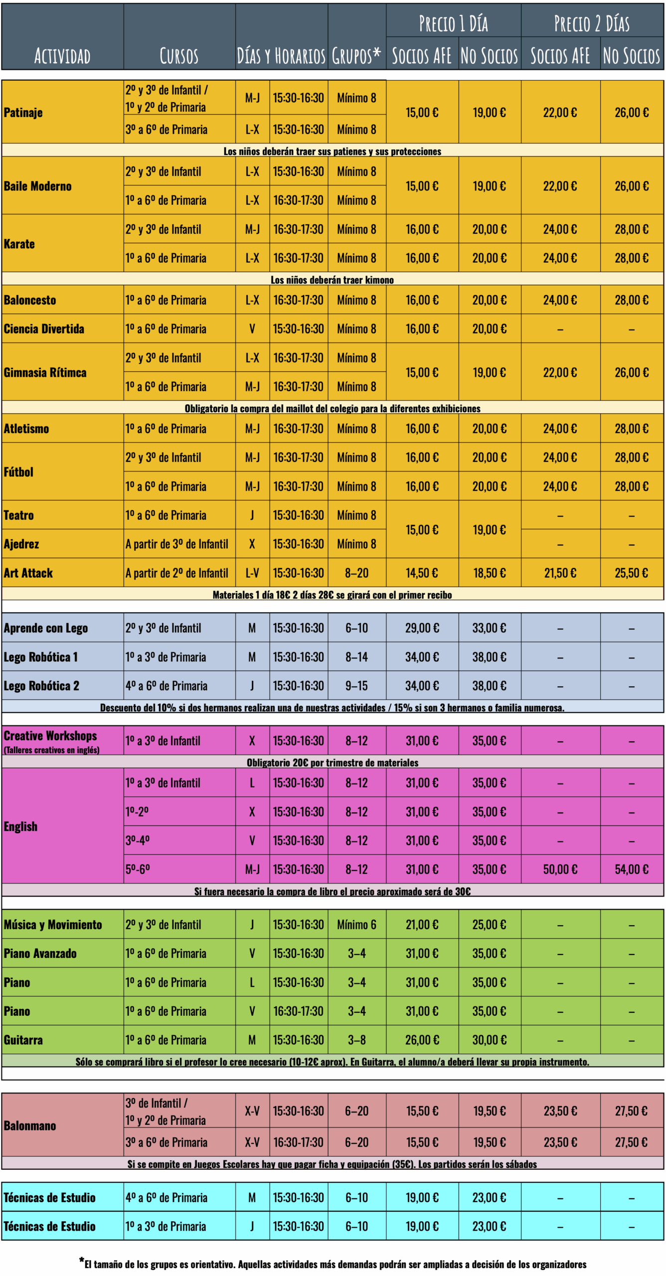IMPORTANTE: Es necesario estar inscrito antes del 20 de octubre en la AFE y presentar el recibo del pago del banco o estar inscrito en el pago domiciliado para obtener el descuento en las actividades extraescolares.