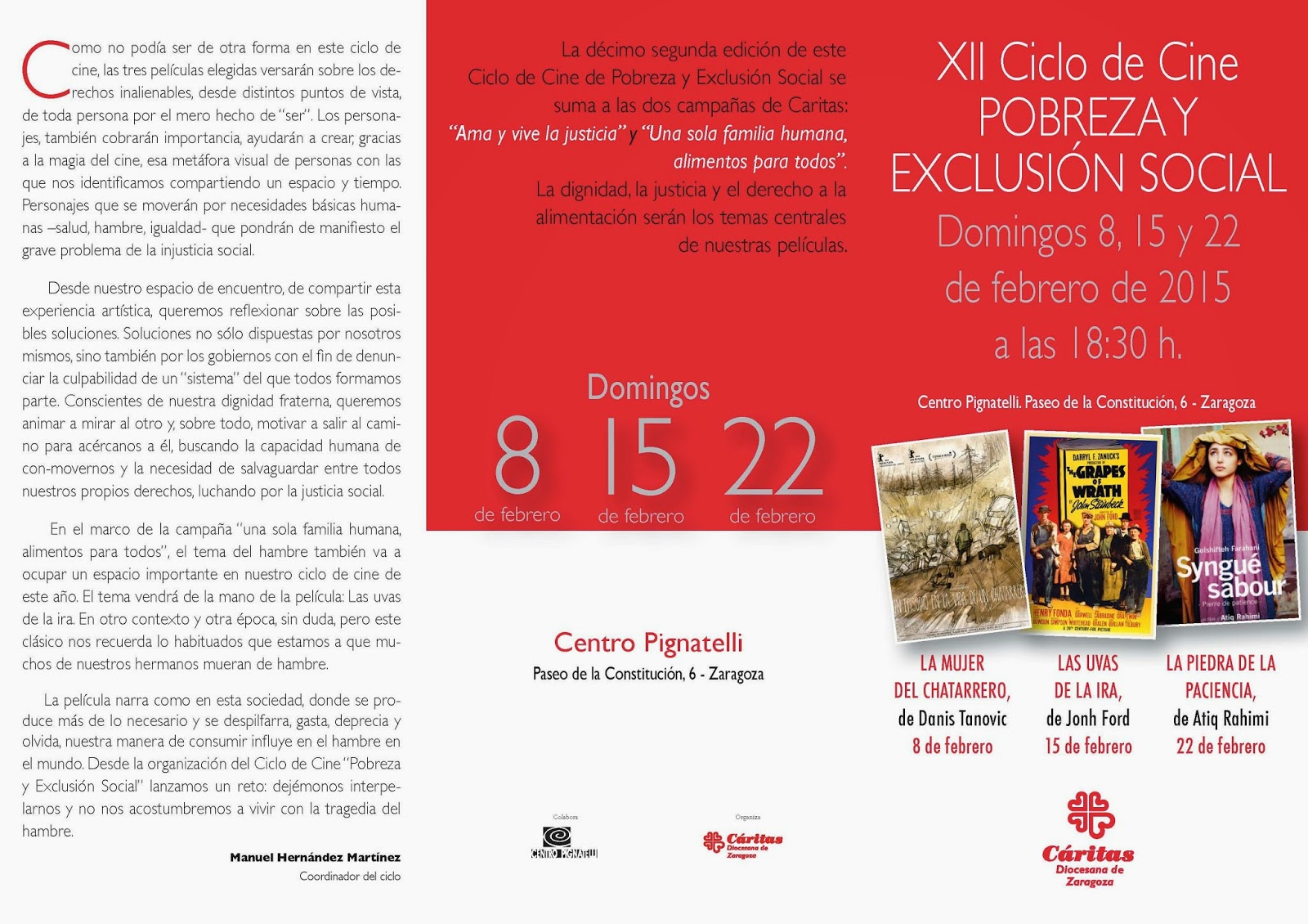 El mes de febrero tendrá lugar el XII Ciclo de Cine «Pobreza y Exclusión Social», organizado por Cáritas. La películas se proyectarán los días 8, 15 y 22 en el Centro Pignatelli (Pº de la Constitución, 6, de Zaragoza) a las 18,30 horas.