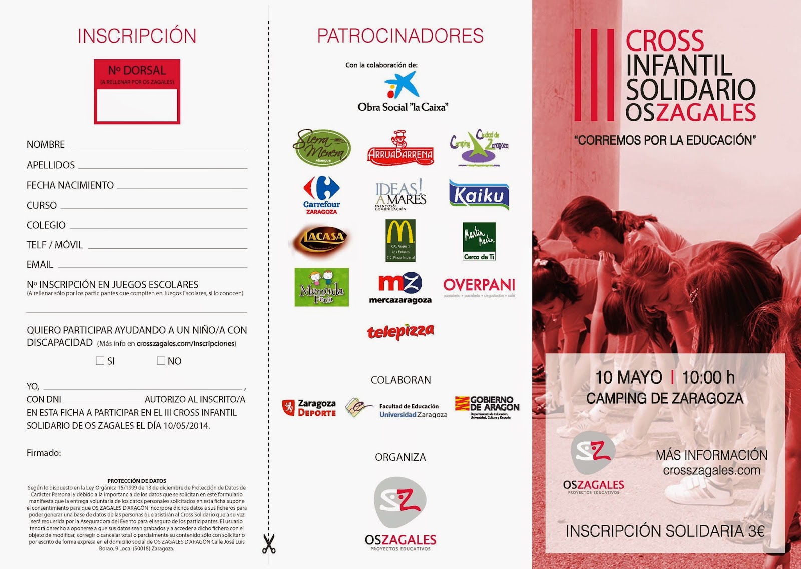 «Corremos por la educación» es lema de la tercera edición del Cross Solidario Os Zagales que se celebrará el 10 de mayo en el Camping de Zaragoza. Los dorsales solidarios tienen un coste de 3 euros, cuya recaudación total se destinará íntegramente a becas de material escolar. Las carreras organizadas van desde los 3 años a adultos.