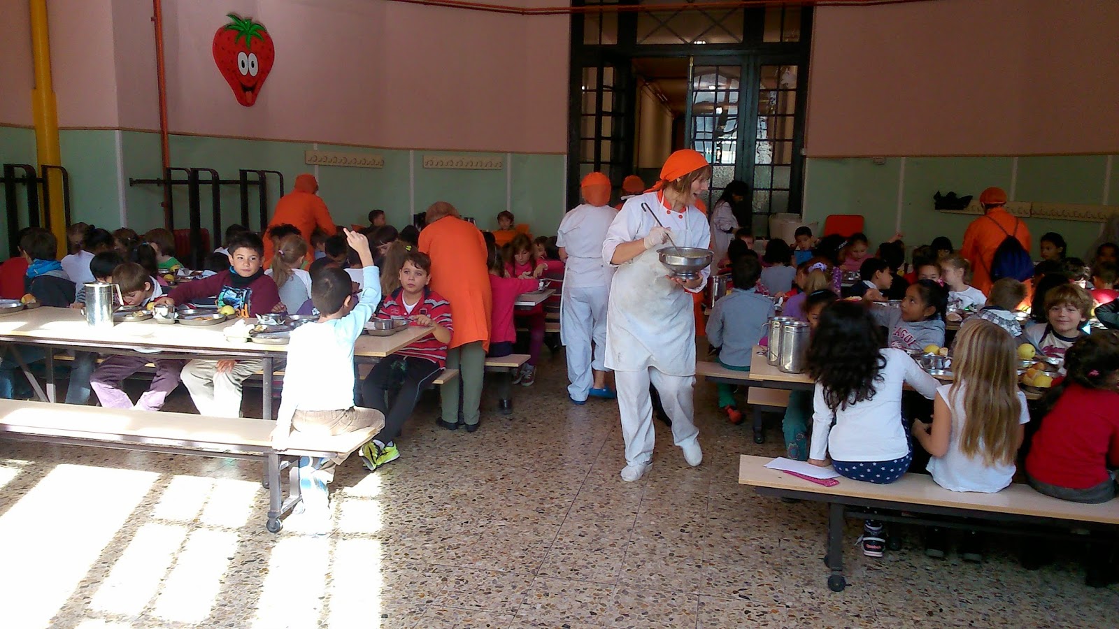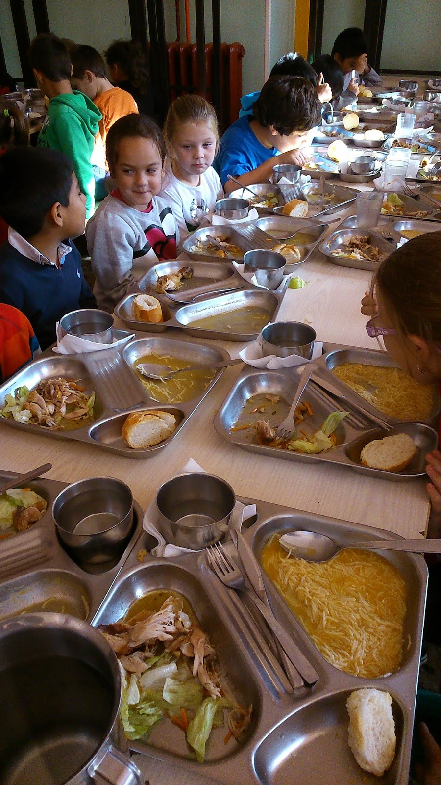 Antes de sentarse a la mesa vieron la elaboración de los platos en la cocina: los ingredientes de la sopa, el pollo en el horno, así como la preparación de las bandejas y su distribución por parte de las 11 monitoras de comedor en las mesas. Una vez sentados a la mesa los niños, las monitoras les ayudan a los pequeños a cortar los alimentos, a rellenar el plato a los que repiten y a pelar la fruta. Los mayores también echan una mano a los más pequeños.