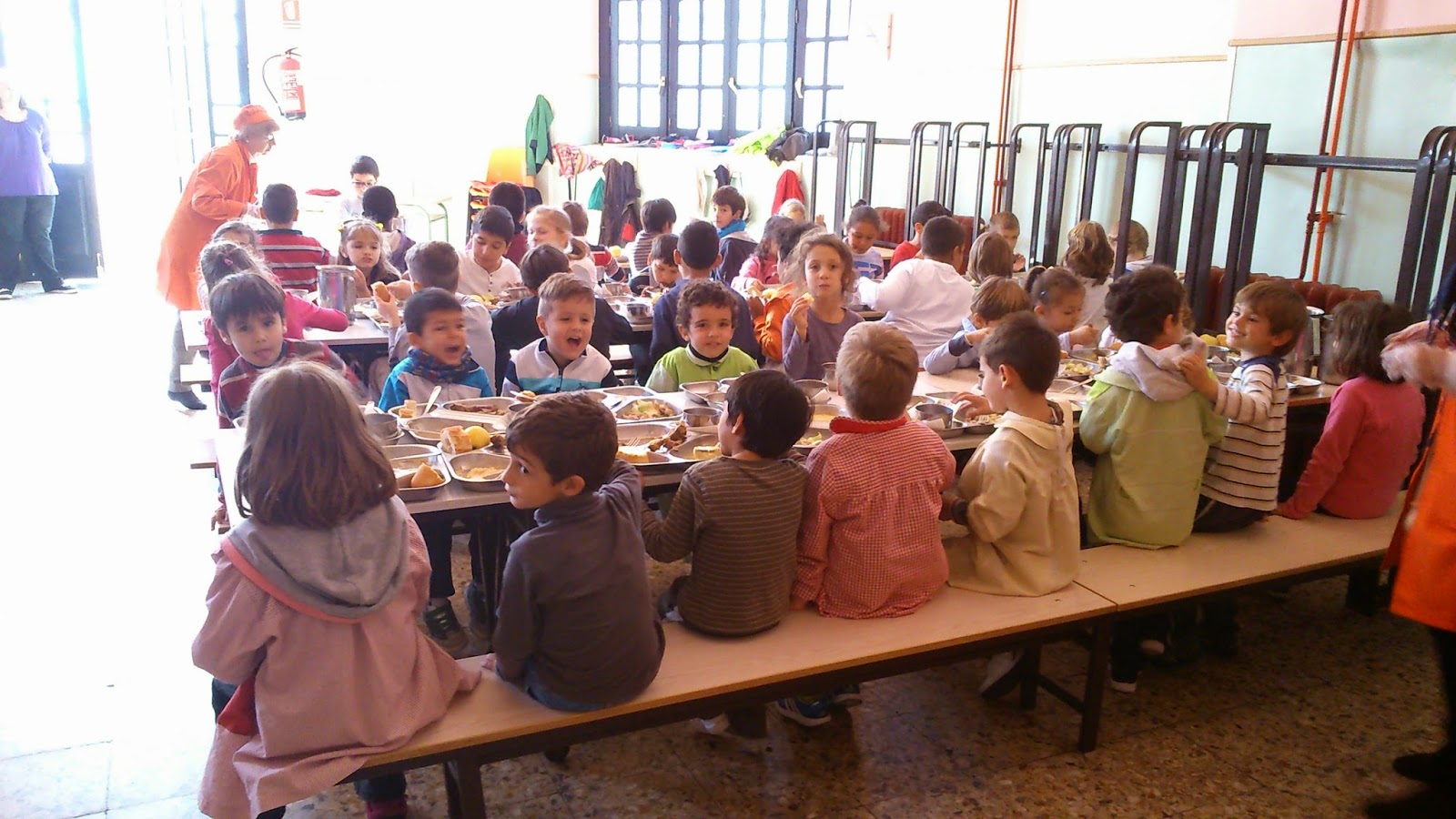 Cuando acabaron de comer, comprobaron que cada niño retira su bandeja y la deja en los carritos. También que entre turno y turno, las monitoras limpian las mesas y vuelven a colocar las bandejas con comida.