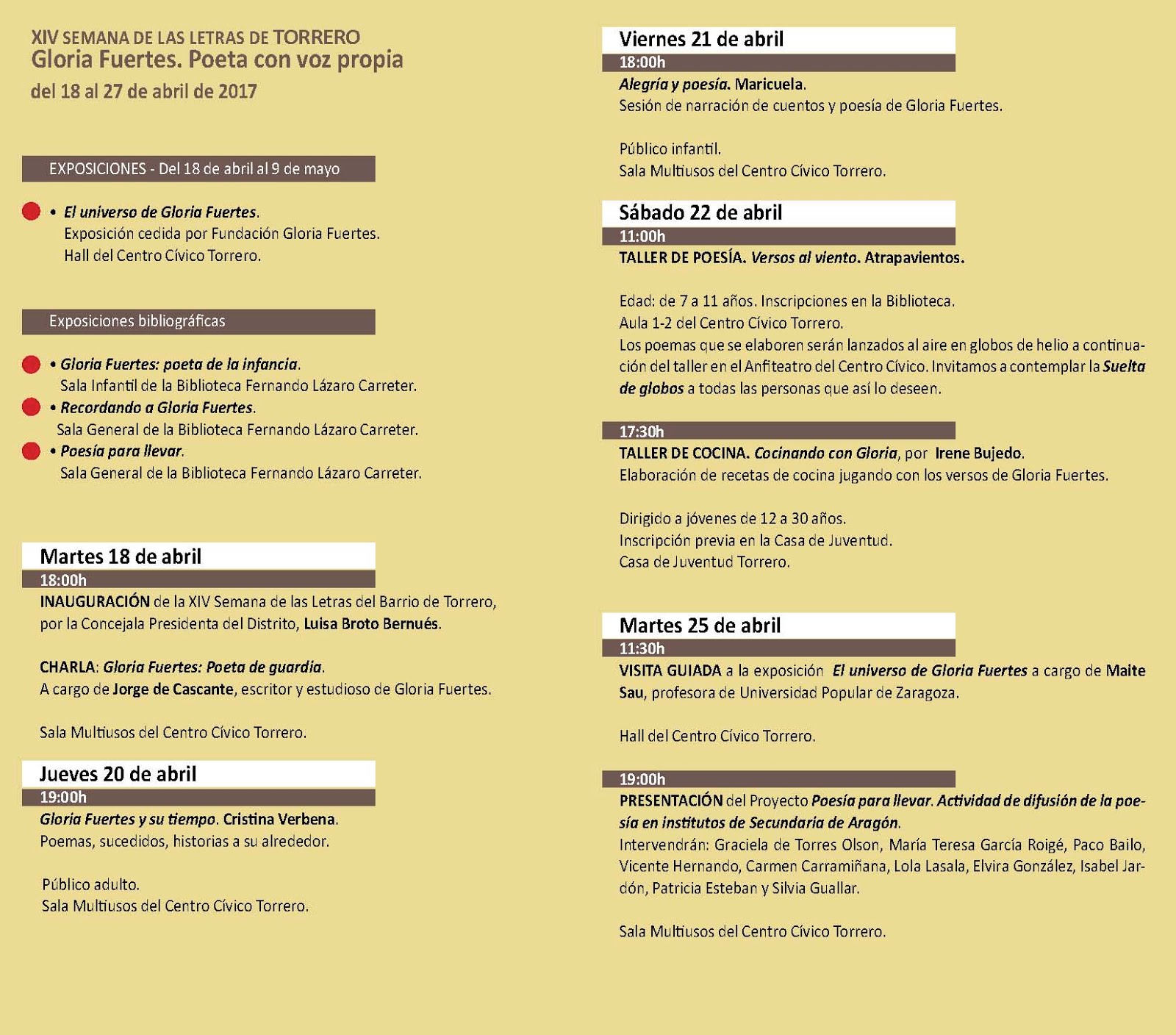 La gran escritora y poeta Gloria Fuertes es la protagonista de la XIV Semana de la letras de Torrero, que se celebra entre el 18 y 27 de abril en el Centro Cívico Torrero con exposiciones, talleres visitas guiadas y lecturas de sus poemas. Todo un homenaje en el centenario de su nacimiento (Madrid 28 de julio de 1914 – 27 de noviembre de 1998).