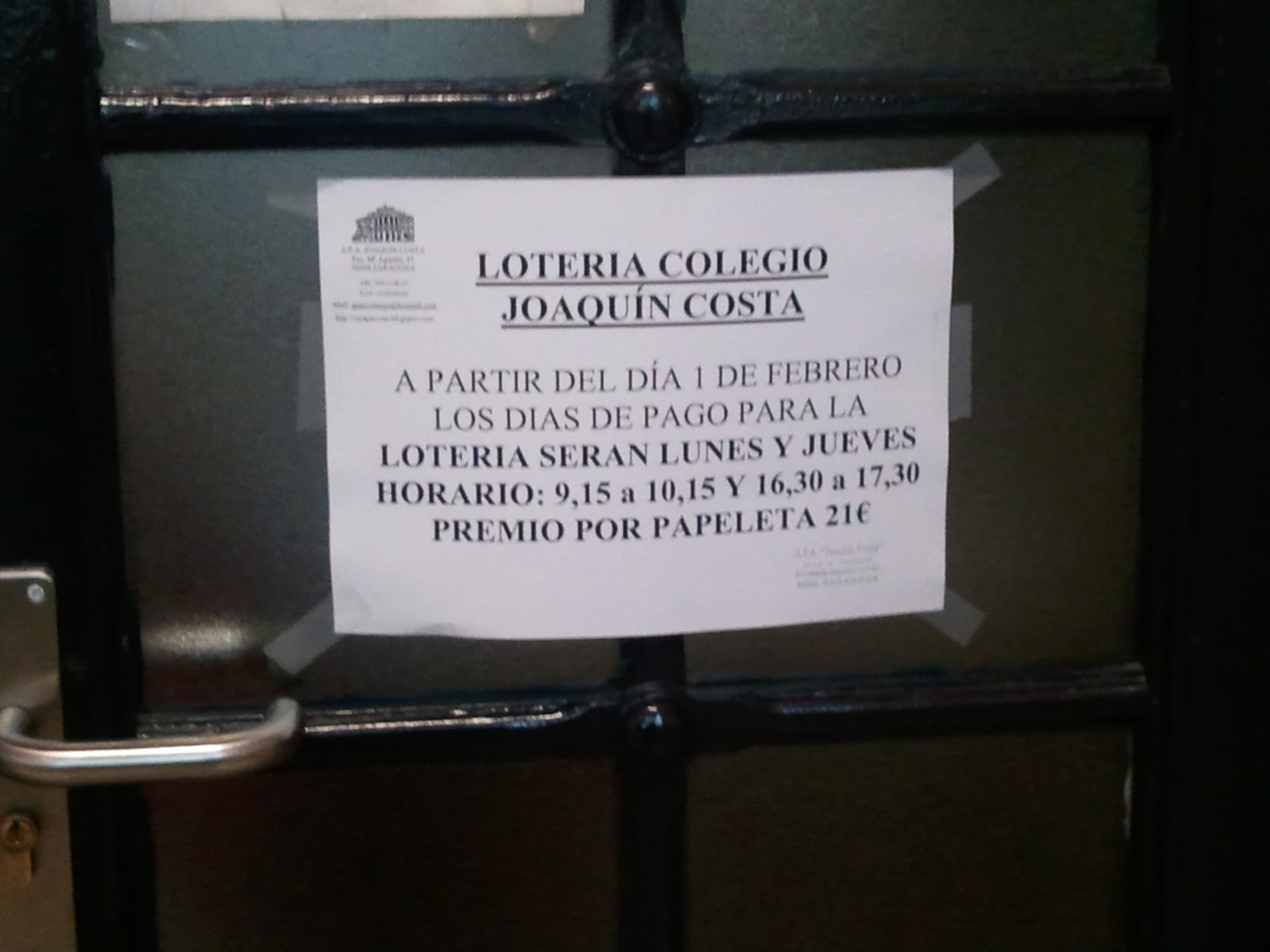 Os recordamos que la lotería de Navidad que vendieron los alumnos de 6º del Colegio Joaquin Costa fue en el sorteo de Navidad. Hasta el momento, el sistema de pagos, por los padres voluntarios, está funcionando de maravilla.