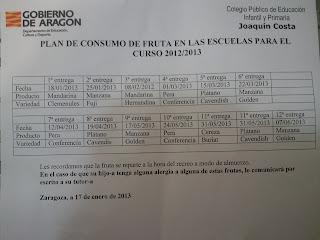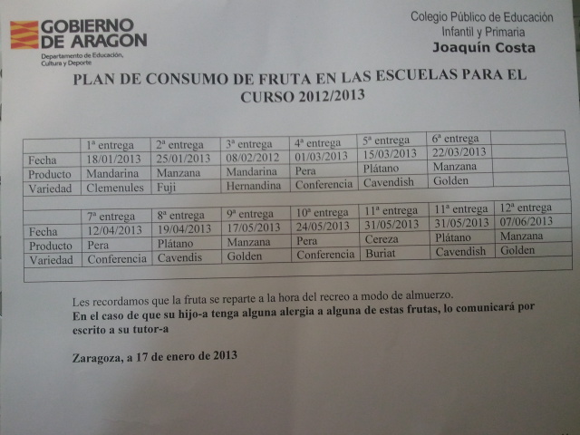 2 viernes de cada mes, de enero al 7 de junio, se entregan a los niños fruta a modo de almuerzo en unos cursos determinados de primaria del Colegio.